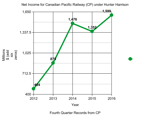 Prior to Harrison’s arrival at CP, net income was decreasing yearly, from $651 million in 2010 to $484 million in 2012. Since Harrison has held the reins at CP, the company’s profit has increased by over a billion dollars. Harrison has also slashed 6,000 jobs.
