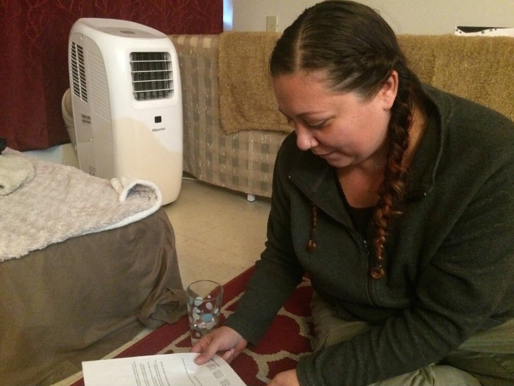 Jeanette Tossounian looks at her file filled with notices she collected since she moved into community housing. She sleeps on the massage table (right) instead of the mattress (left). Photo by Katie Jacobs.