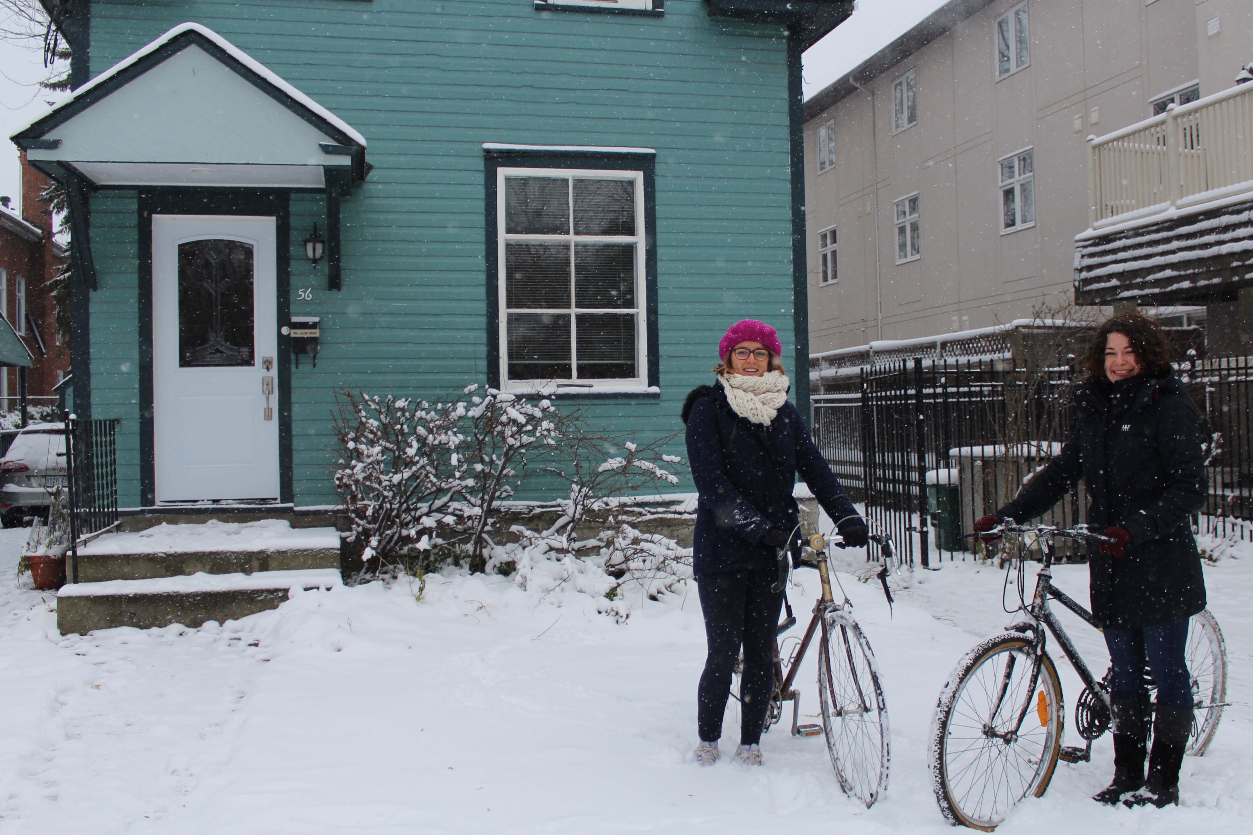 Savannah de Boer (left) and Marina Cañellas (right) as they hesitate to ride their bike after the first snow fall of the year. (Photo : Chloé Fiancette)