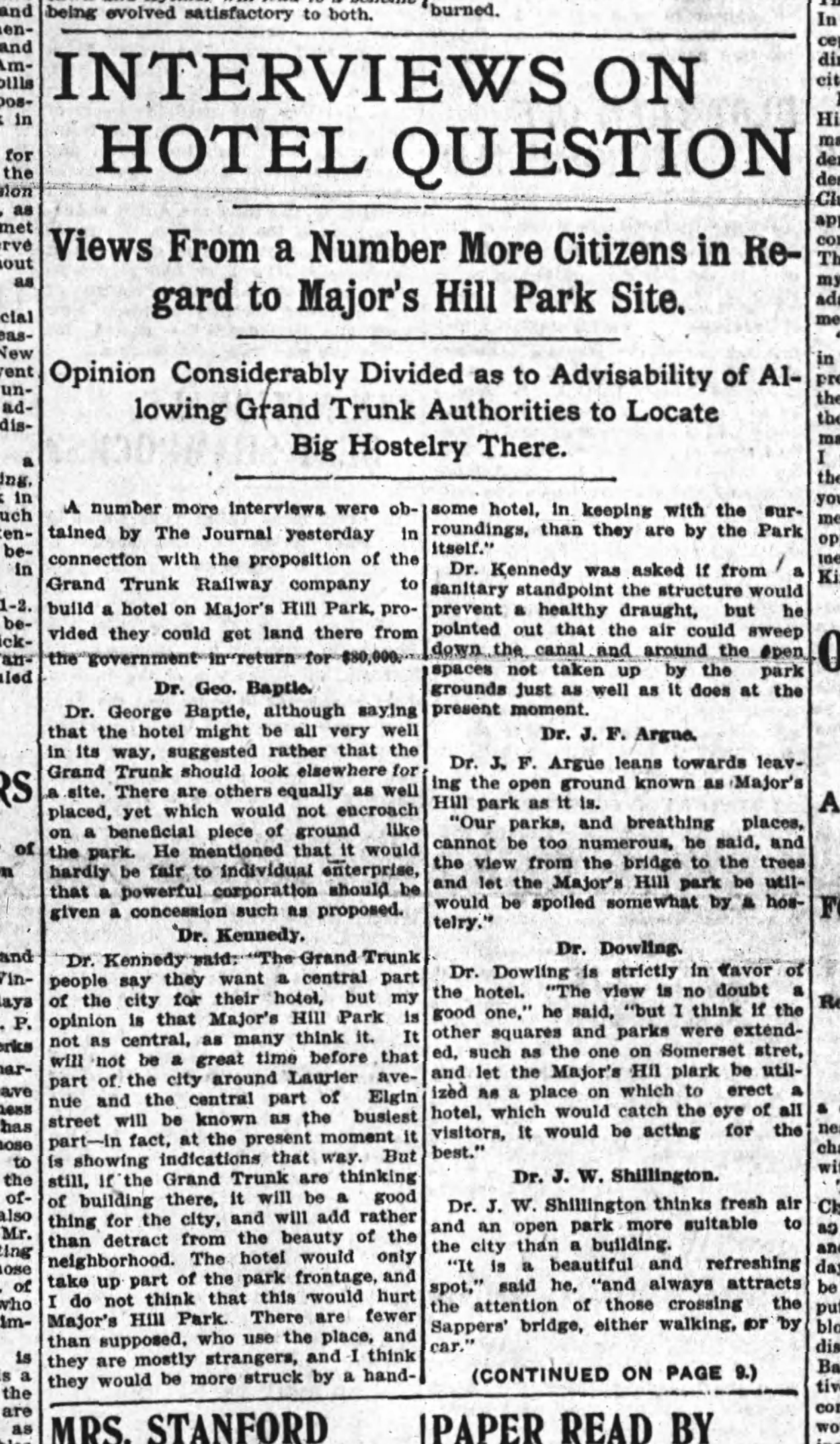Not all Ottawans opposed the site, however. A Dr. Kennedy expressed that most park-goers weren’t actually from the city, and “would be more struck by a handsome hotel [. . .] than they are by the Park itself.”