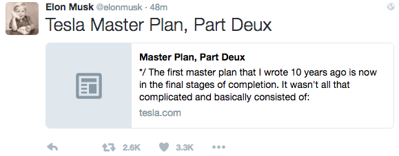 Tesla’s legendary CEO, Elon Musk, defiantly took his eyes off the road and stared into the sun after unveiling his “Master Plan” (“Part Deux”) on twitter last night.