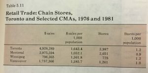 In retail sales of the period, Toronto again had the upper hand on Montreal: there were 1.3 chain stores to serve every 1,000 Torontonians, compared with 0.9 stores per 1,000 Montrealers.
