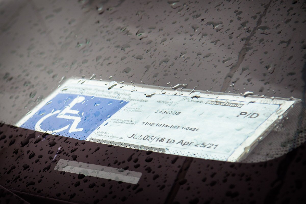 An accessible parking permit sits on the dashboard of a car parked at the Walmart Supercentre at the Ottawa Train Yards on Oct. 22, 2016. In 2015, 133 people received tickets there for illegally parking in a space reserved for the physically disabled — more than anywhere else in Ottawa that year. CARLETON UNIVERSITY/Marc-André Cossette