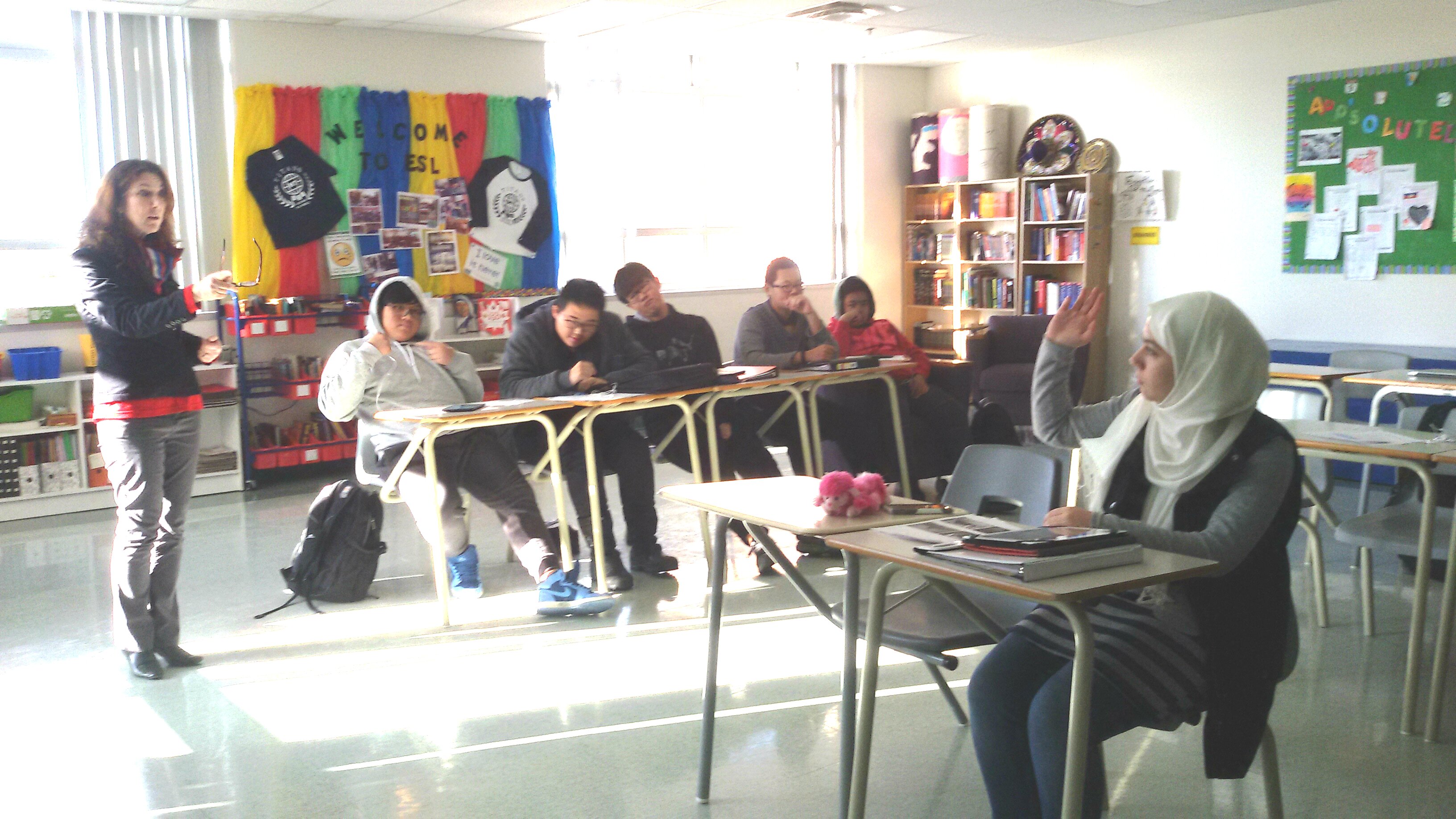 Taltello attends regular courses throughout the school day, except for one class where she joins other students learning English as a Second Language (ESL). Her teacher, Janet Birmingham, says several students in this class came to Canada as immigrants or refugees. They often face difficulties when adjusting to the expectations of a new school and learning to express themselves in a new language.